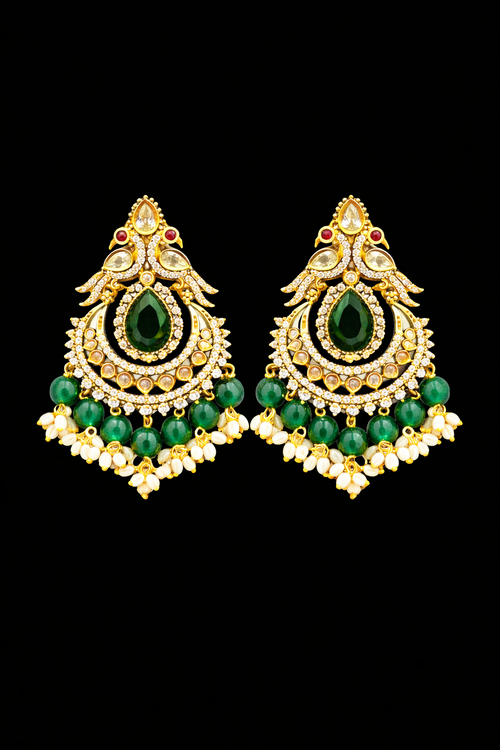 Antique Gold Chandbali Earrings with Green Stone & Pearl Drops